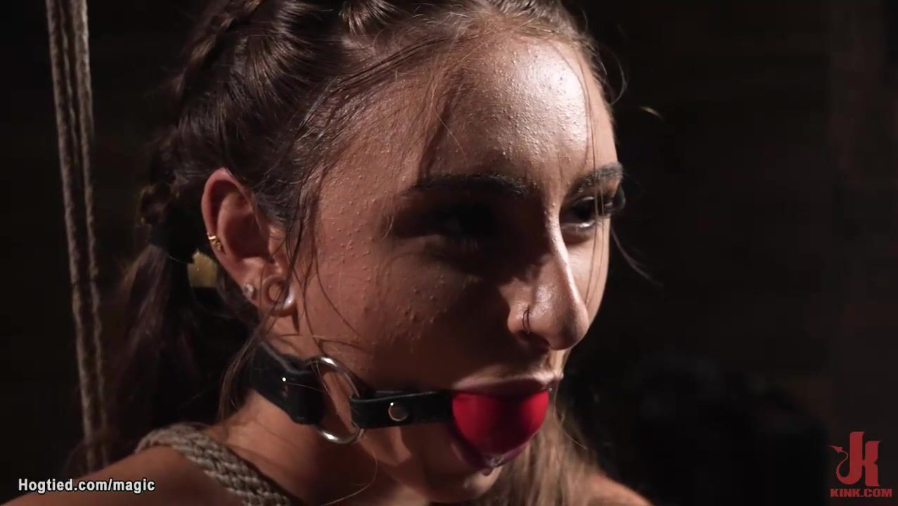 Busty brunette slave Penelope Kay bound in standing position on one leg made piss on the floor then pussy finger fucked and mounted on sybian down on her knees by master The Pope on hogtied