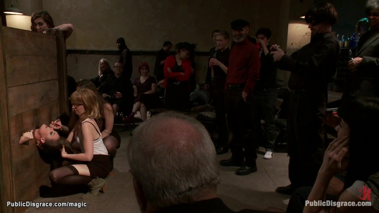Hot busty brunette lesbian slave Melissa Jacobs is gagged and bound by group of lesbian strangers then tormented and fucked in public place in front of horny viewers