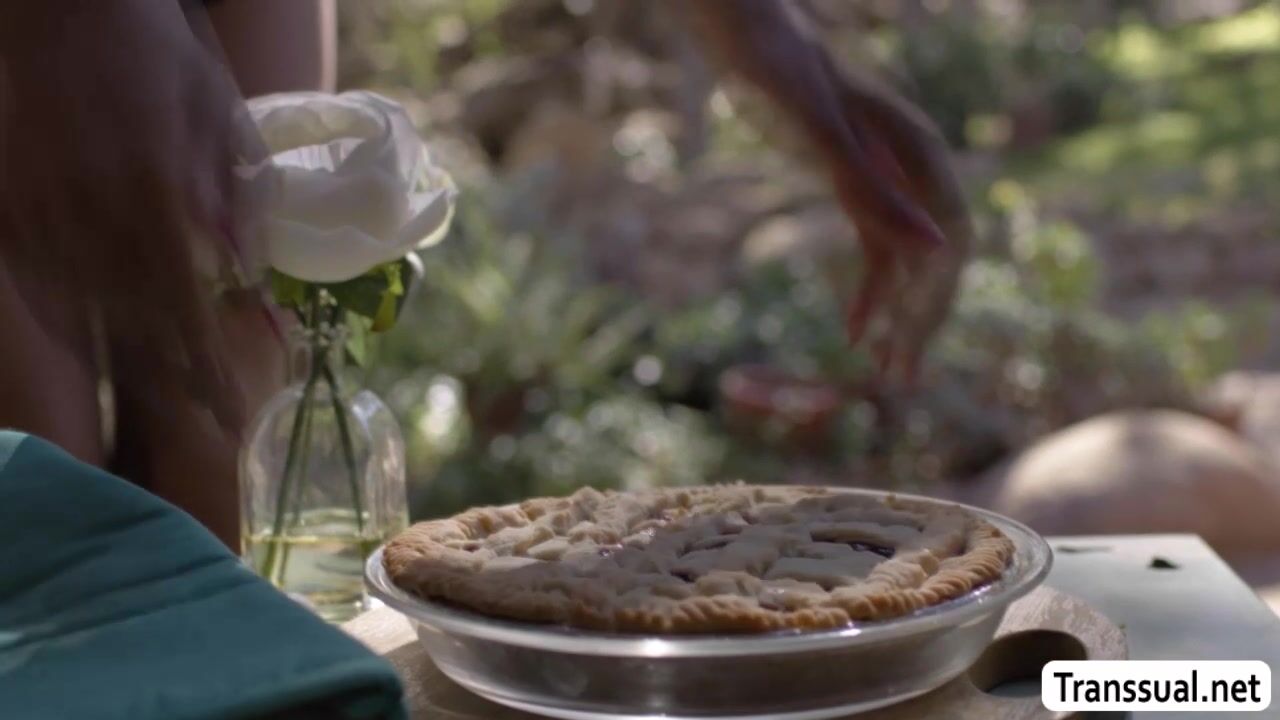Mature blonde bakes a pie and then she lets it relaxed for a few minutes while shes masturbating her pussy on the couch.After that,her TS neighbor arrives and she then fucks her pie.Instead of getting mad,she throats her tranny cock and rides it.