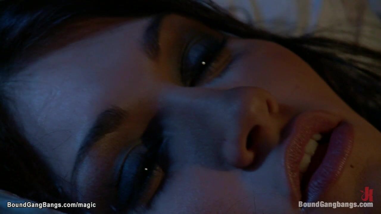 Sexy horny brunette babe Jade Indica masturbates in bed and has fanatsy being dragged in basement by captors and interracial gang bang fucked with big cocks