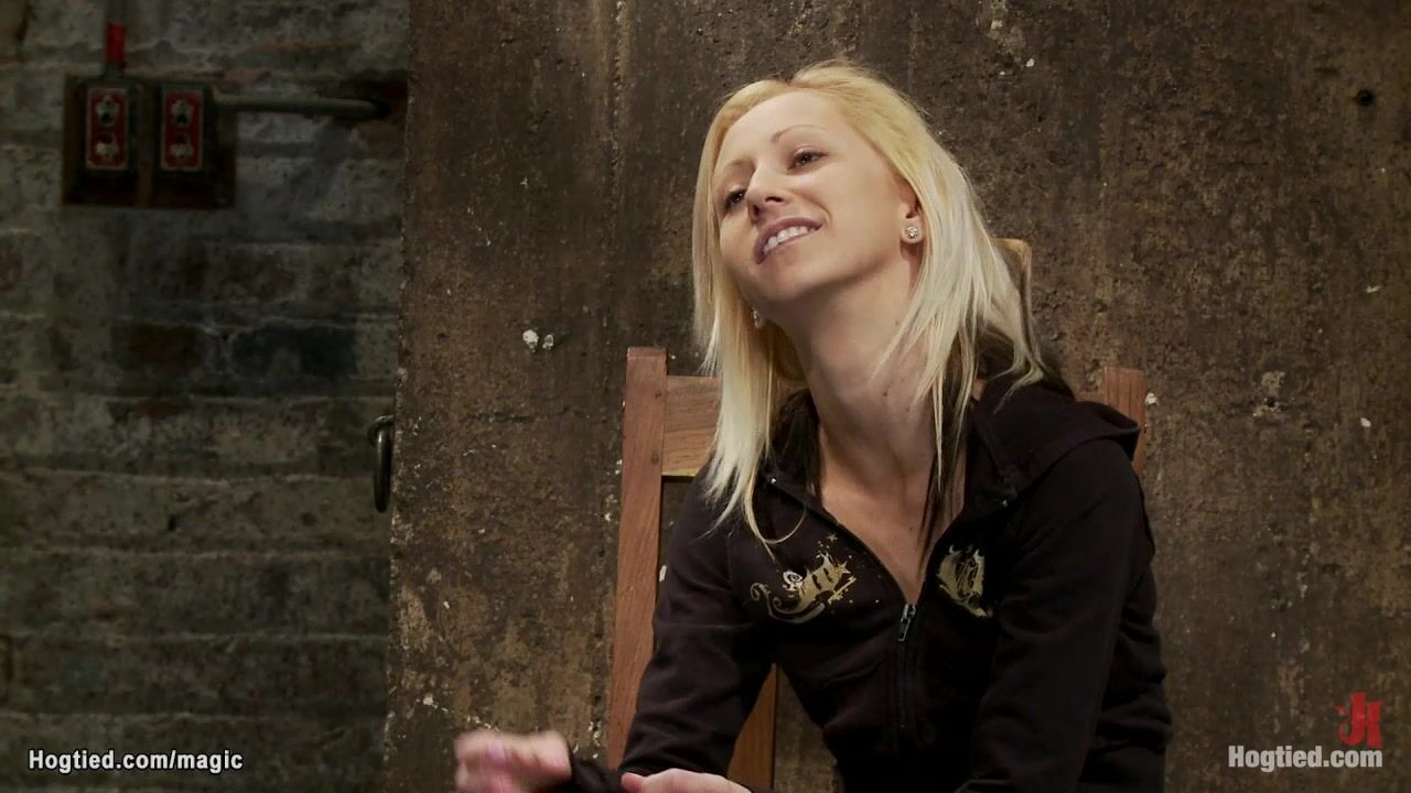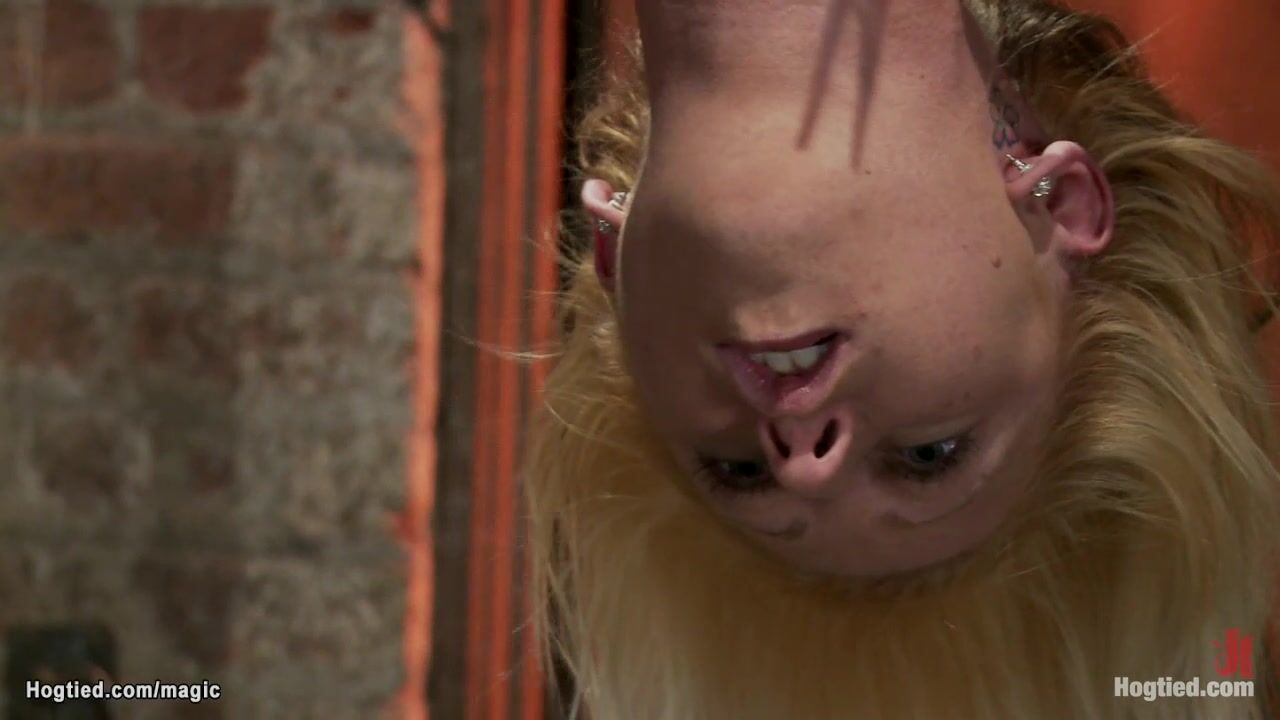 Masked master Matt Williams binds and suspends petite blonde slave Rene Phoenix in upside down position and whips her tight belly and crotch on hogtied