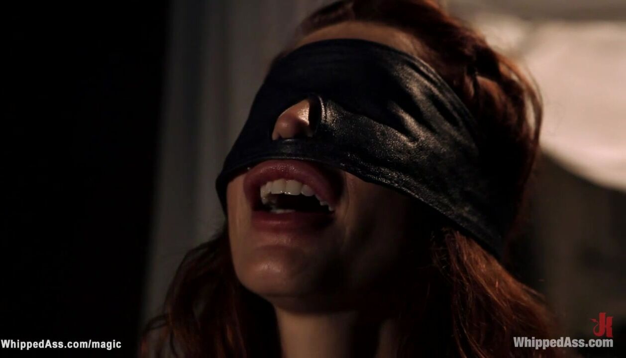 Big tits red head lesbian babe Monique Alexander is bound down on her knees and gets ass and bare feet caned then in bed anal fucked by lezdom Bobbi Starr
