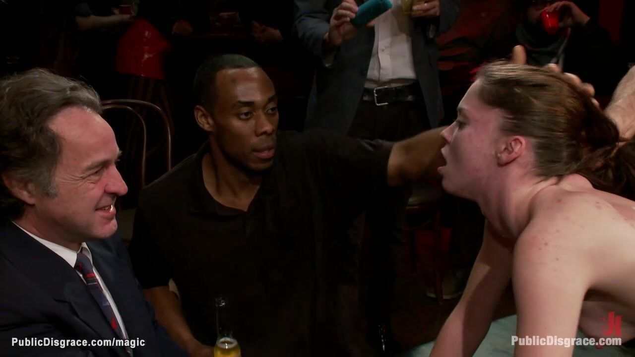 Dom Princess Donna Dolore zippers and binds slave Jessi Palmer and fucks her with dick on a stick then James Deen fucks her with big cock in crowded public bar