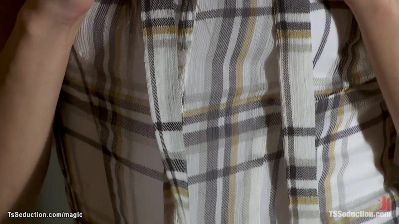Hot brunette shemale Honey Foxxx seduces her piano teacher Johnny and kisses him on the couch then binds his wrists and fucks his throat then ass with big dick