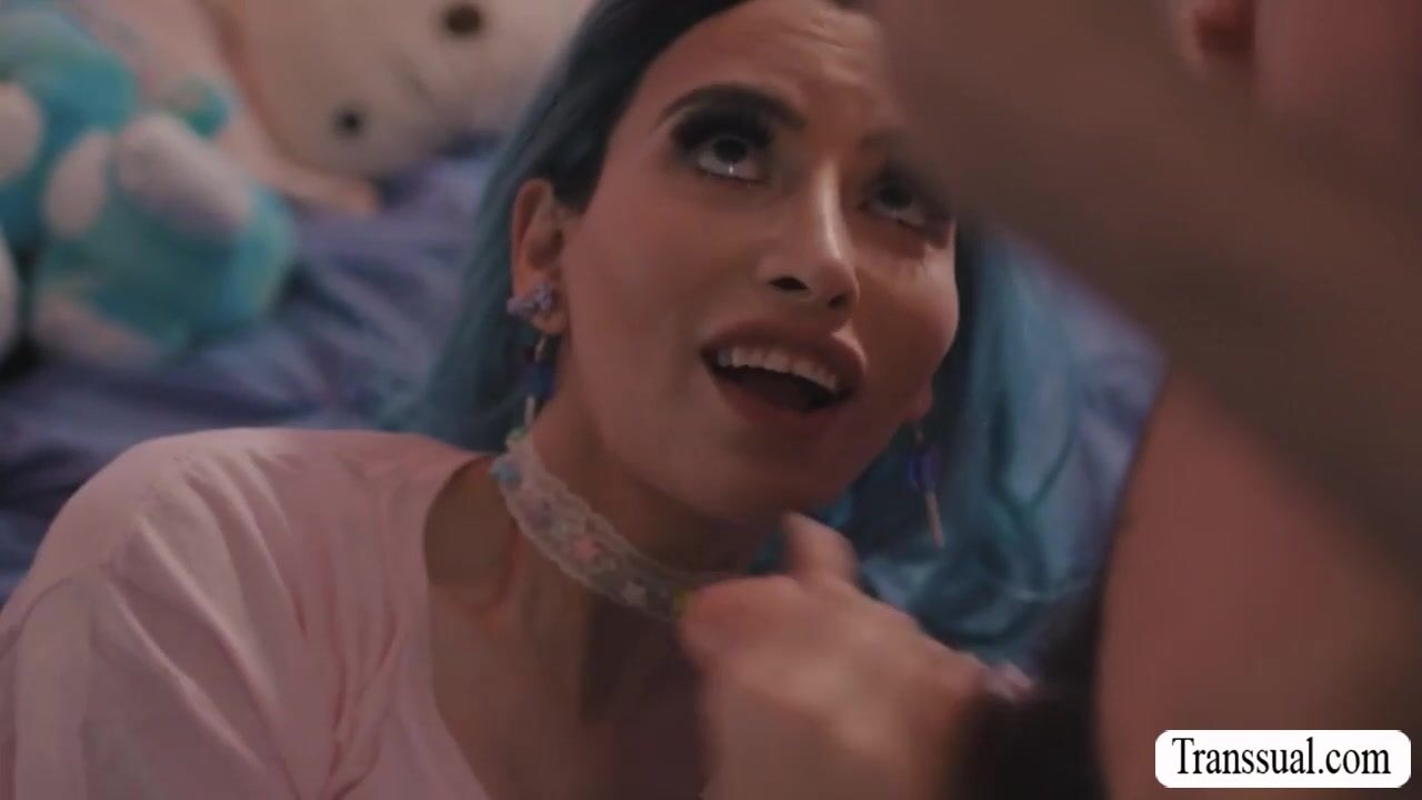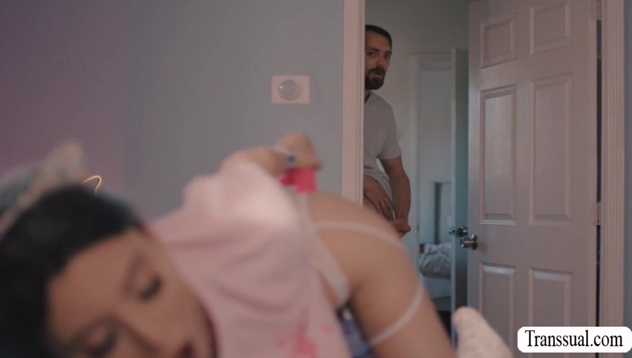 Slut shemale Korra Del Rio invites her guy neighbor to watch her while shes toying her ass in her room.After that,she calls the guy neighbor and lets him bareback fuck her wet ass.In return,she throats his dick and lets him analed her ass again.