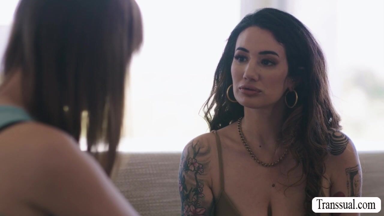 Tattooed MILF comforts her TS stepdaughter by kissing her passionately.After that,she lets her TS stepdaughter suck her nipples and in return,she throats his hard shecock.Next is,her TS stepdaughter licks her pussy and fucks it so hard.