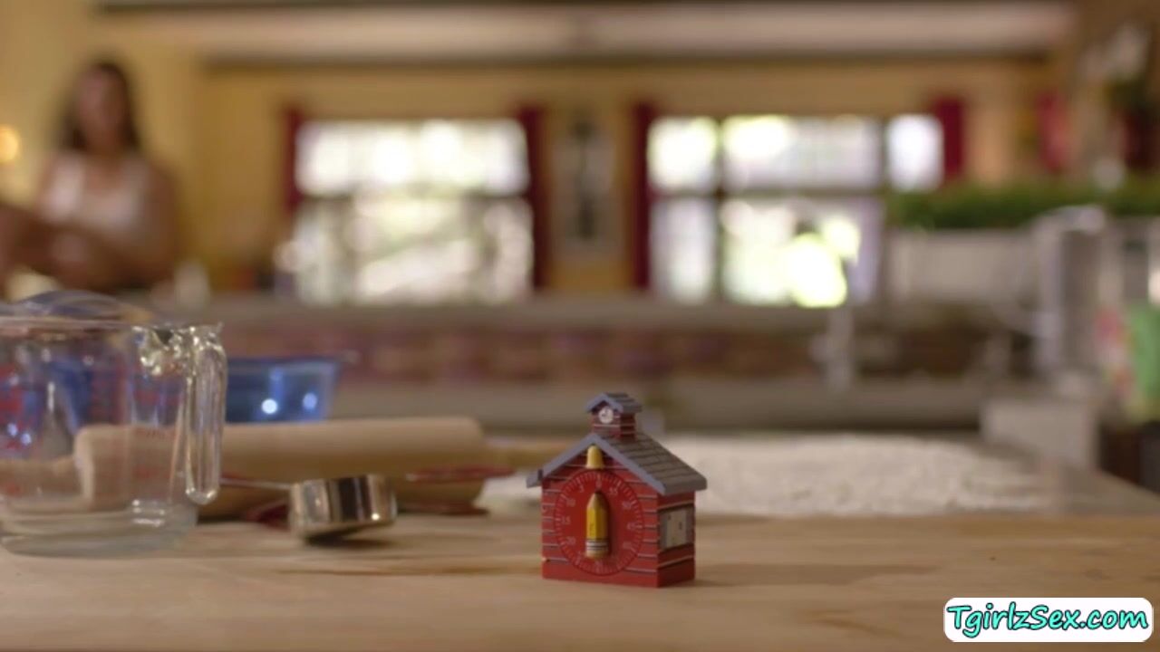 Tall ts Tori Easton fucks big tits milf pussy in the kitchen