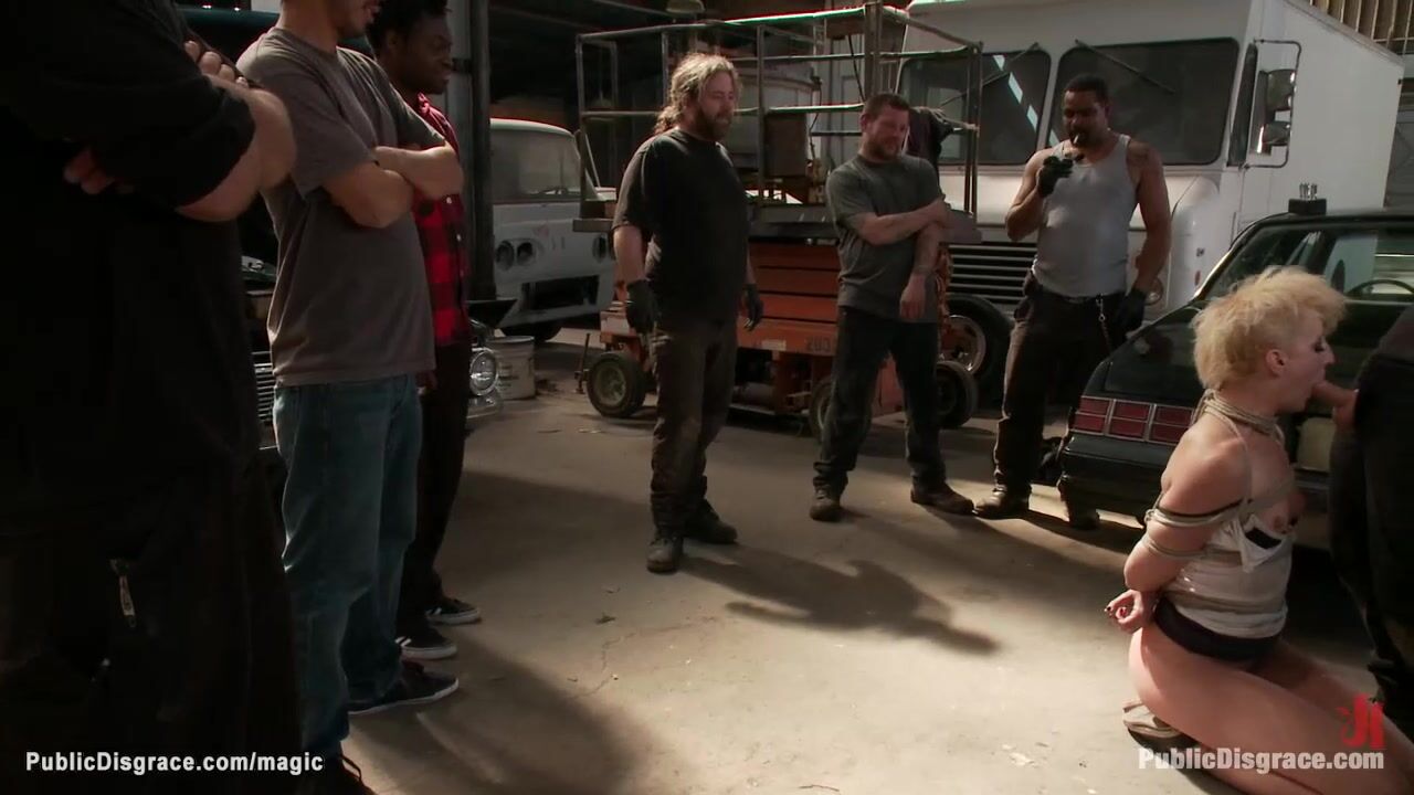 Master Tommy Pistol drags blonde slave Dylan Ryan in auto repair shop and disgraces her in front of workers throat and anal fucked by his big cock on her knees and back
