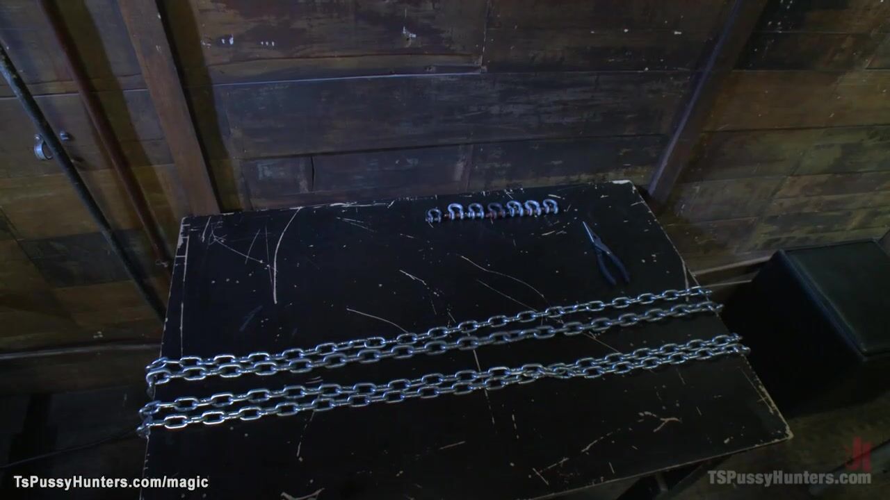 Beautiful little brunette babe Katrina Zova lets tall big tits shemale Honey Foxxx know she is got a kinky desire then sucks her huge cock in bed in dungeon