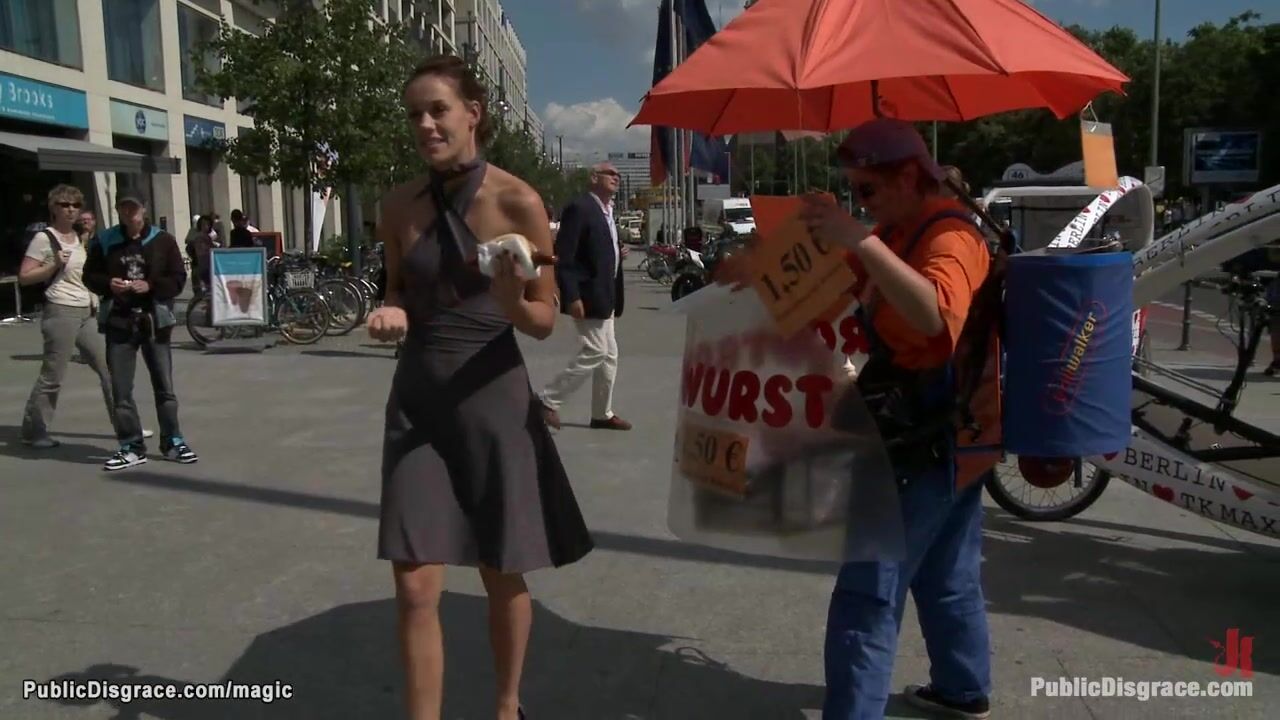 Hot MILF lezdom Princess Donna Dolore walks throug public streets German babe Black Lady with remotely controlled sex toy in pussy then Tommy Pistol fucks her in pussy and mouth outdoors