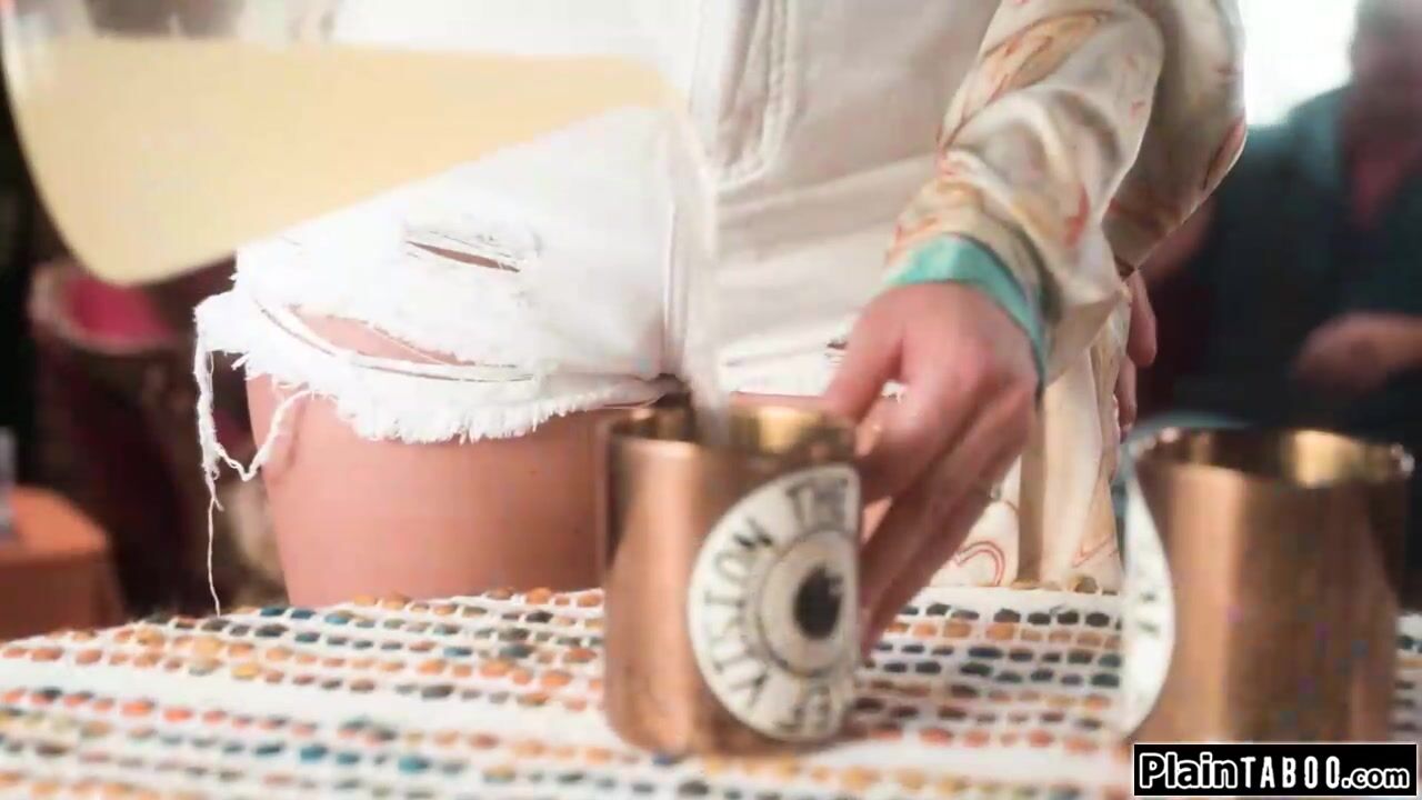 Busty tattooed brunette pours some lemonade for two workers when one starts kissing her.The sucks her big tits and she deepthroats their big hard cocks.The babe gets her pussy licked and sucks on a guys balls while the other is banging her snatch