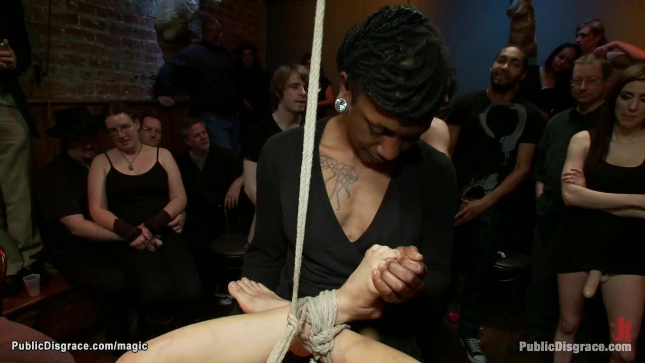 Busty bound brunette slave Vai down on her knees gets throat group fucked then rough big cock and strap on cock fucked till pussy cattle prodded by dom Princess Donna Dolore in public