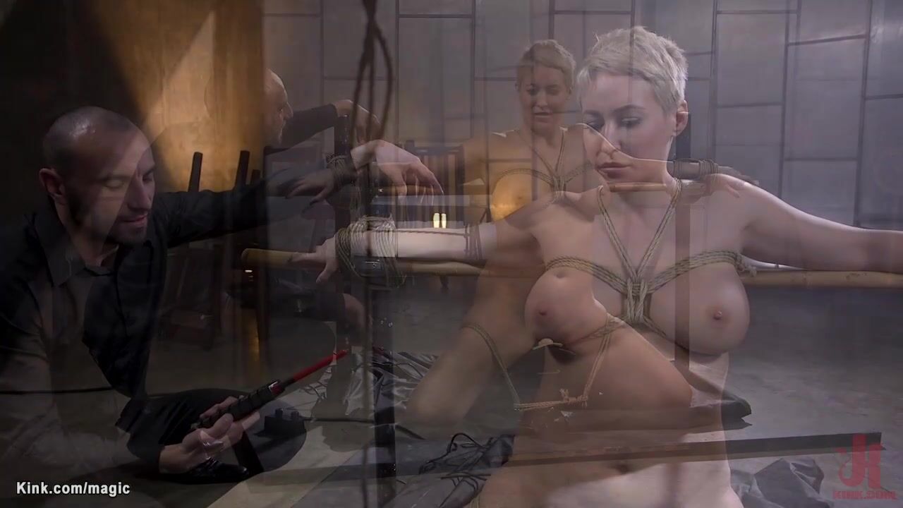 Big boobs blonde MILF slave Ryan Keely bound with legs in the air and hard ass whipped then mounted on sybian and throat fucked till laid on table pussy fucked by big cock master Stirling Cooper