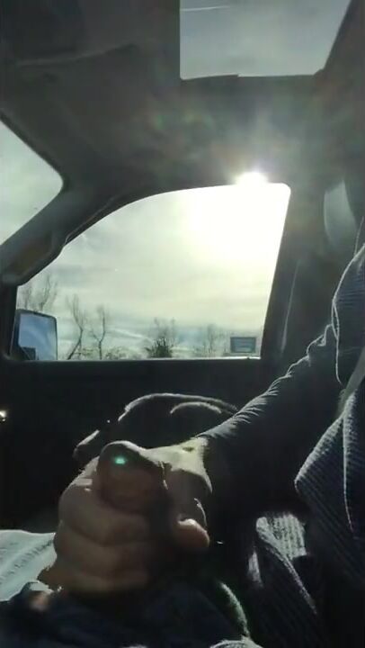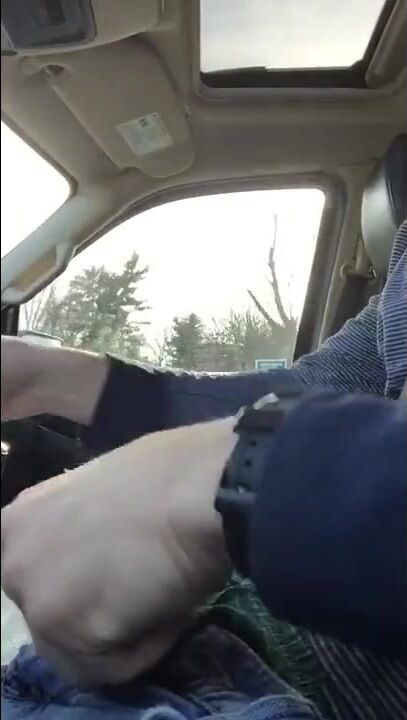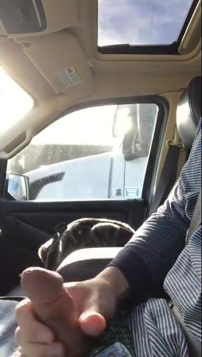 Jerking off and cumming while driving on highway. Pass several trucks and a tour bus full of people.