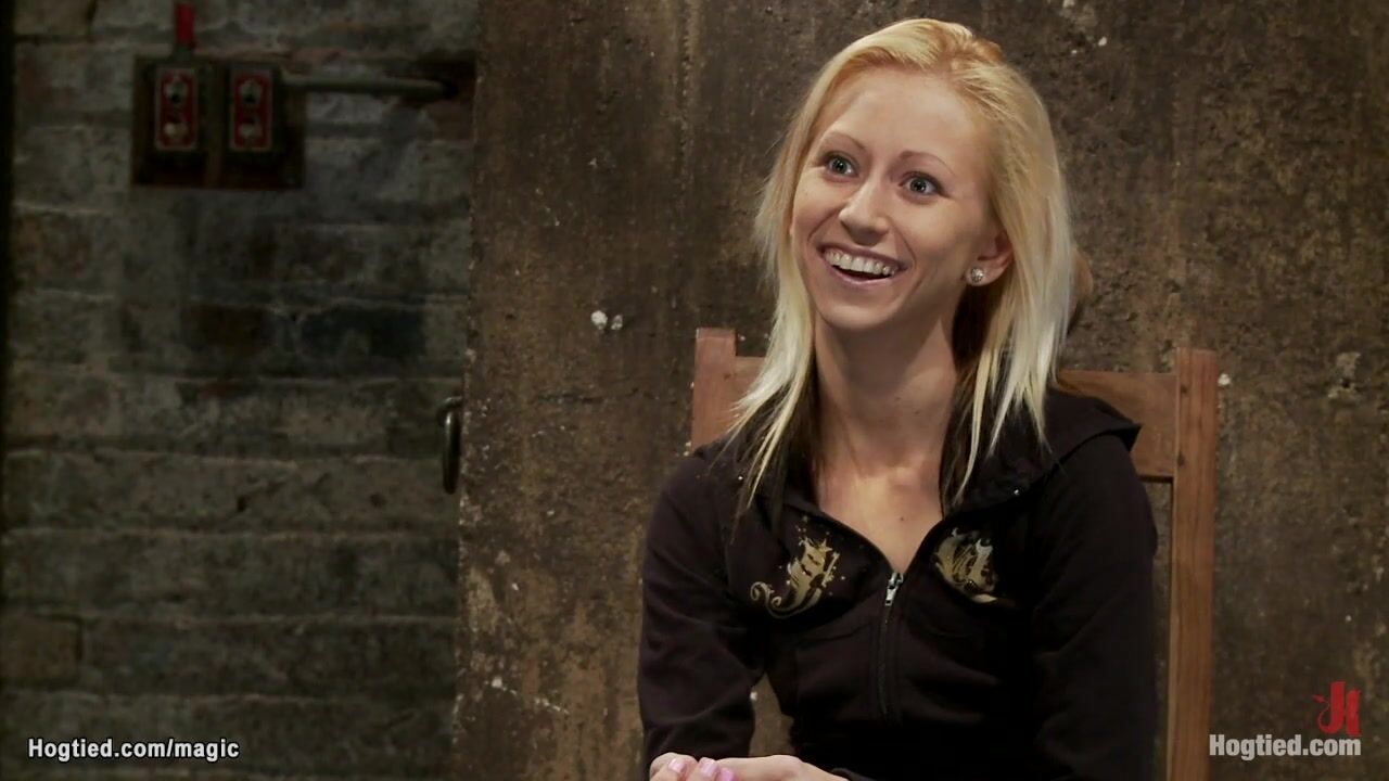 Description: Slim blonde slave Rene Phoenix is bound in hogtie position over padded chest with hook in the ass and ball gag in mouth then pulled in the air by master Matt Williams