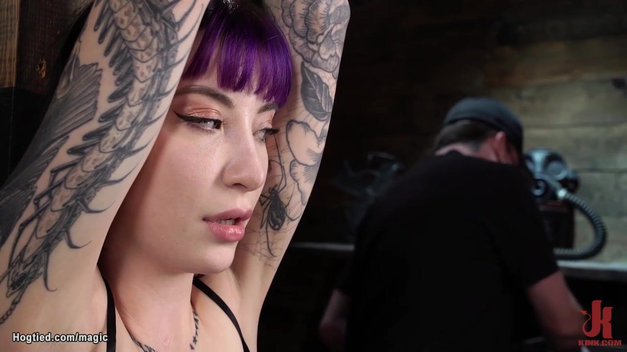 Small tits little tattooed purple haired slave Charlotte Sartre is bound to wooden column by master The Pope then in upside down suspension spanked and whipped