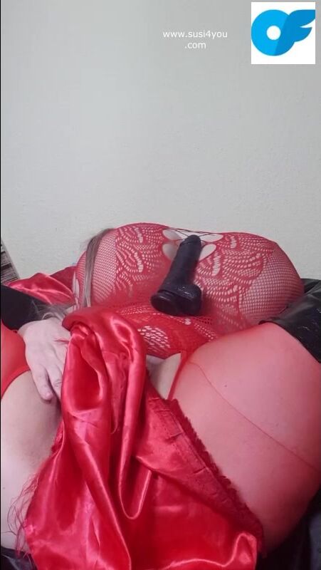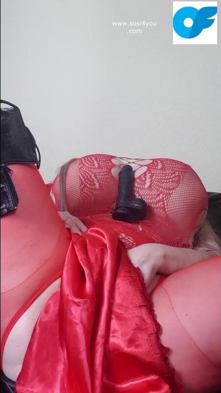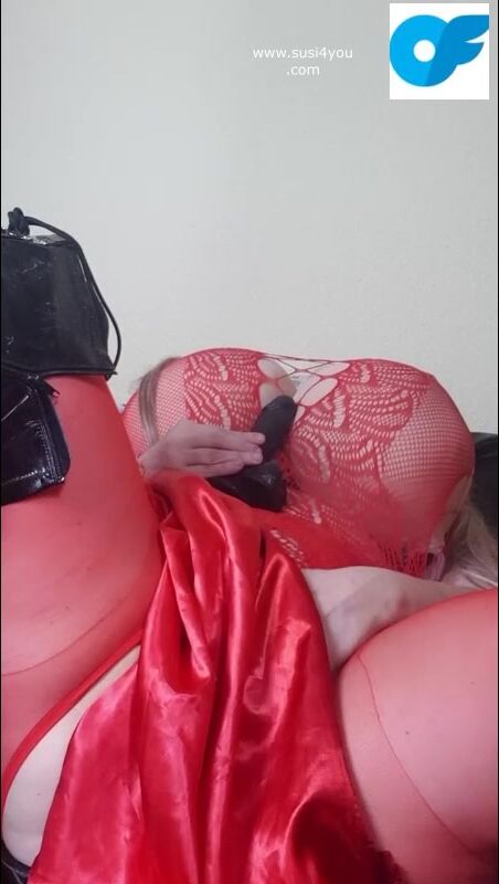 Sexy Susi is wearing red fishnet She is rubbing her pussy with bbc
