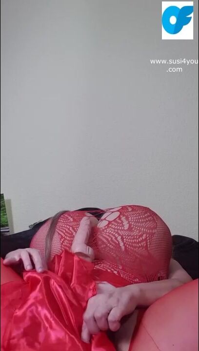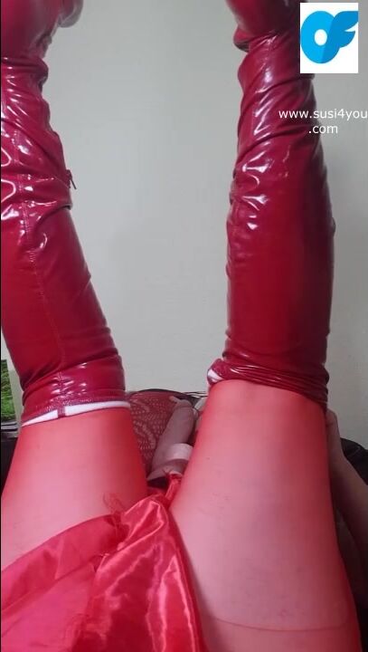 I am lying on my back Susi spreads her legs hear her moaning. Playing with toy in red fishnet pulling out fat tis showing them moaning lets cum together you like my red boots i have put them on just for you.