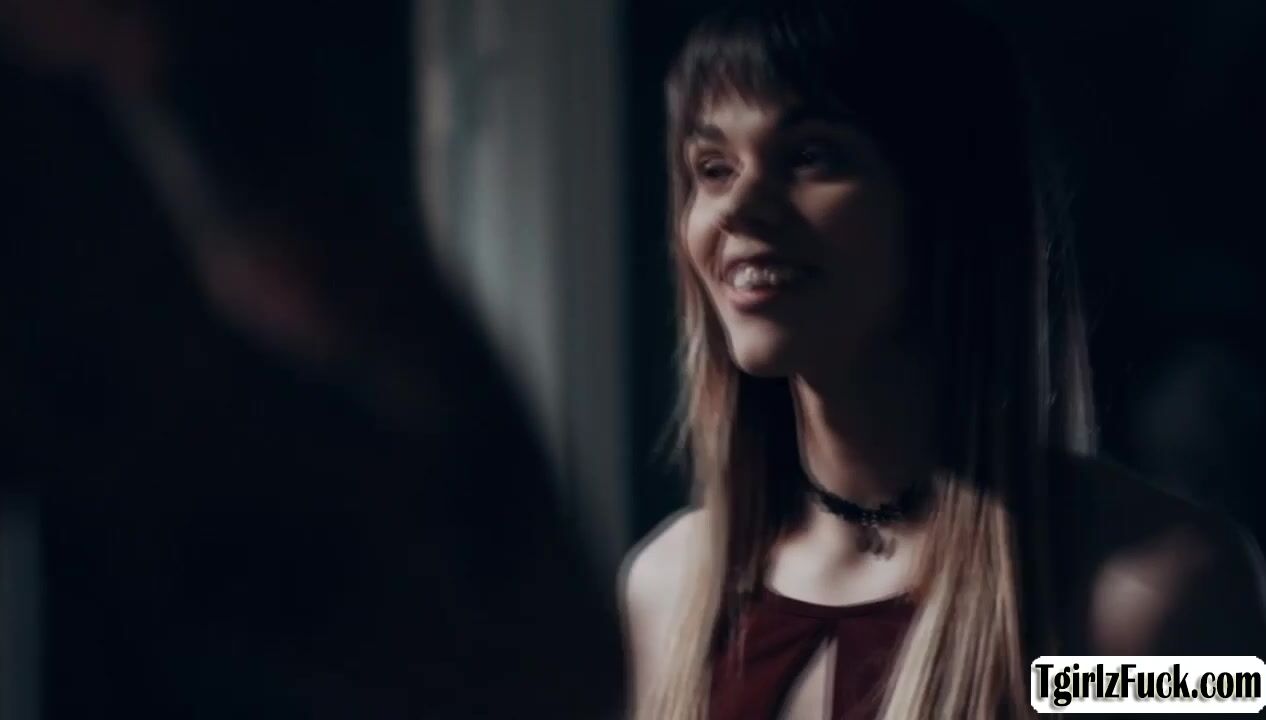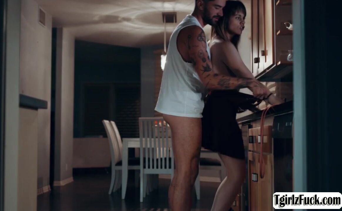 A pretty yet skinny small tits transexual Kate Zoha flirts with hunks straight guy Chris Damned kissing passionately before she bows down giving his bigcock a messy blowjob. The brunette shemale spreads her ass to take his dick for a hardcore anal bareback.