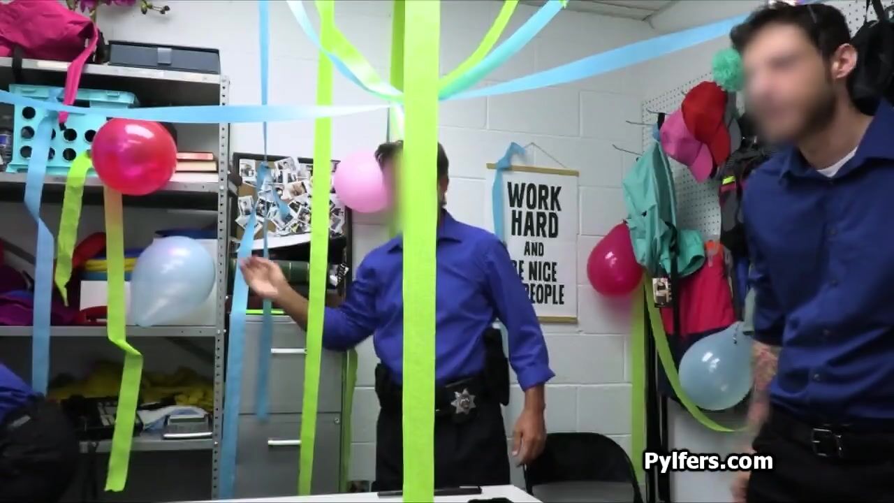 Seems like one of the security guards is saying goodbye, however a hot blonde ends up in the office. Just in time for a perfect gangbang party!