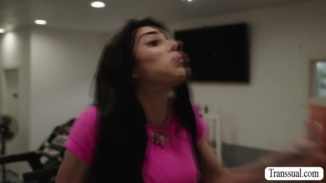 Horny bald dude cant resists the super hot TS working out in the gym.He rips off her leggings and licks her ass to makes it wet.In return,busty TS throat his hard big cock passionately and lets him bareback fuck her wet ass.