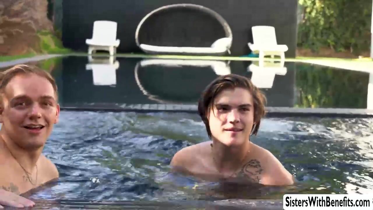 Blondes Theodora and Tyler Von Skeet want to fuck their hunk stepbrothers Coco and Josh Badcoxx so they flirt and engage in heated outdoor pool sex. The petite teens strokes their bigcocks and blowjob it before the dudes fuck their stepsisters pussy foursome.