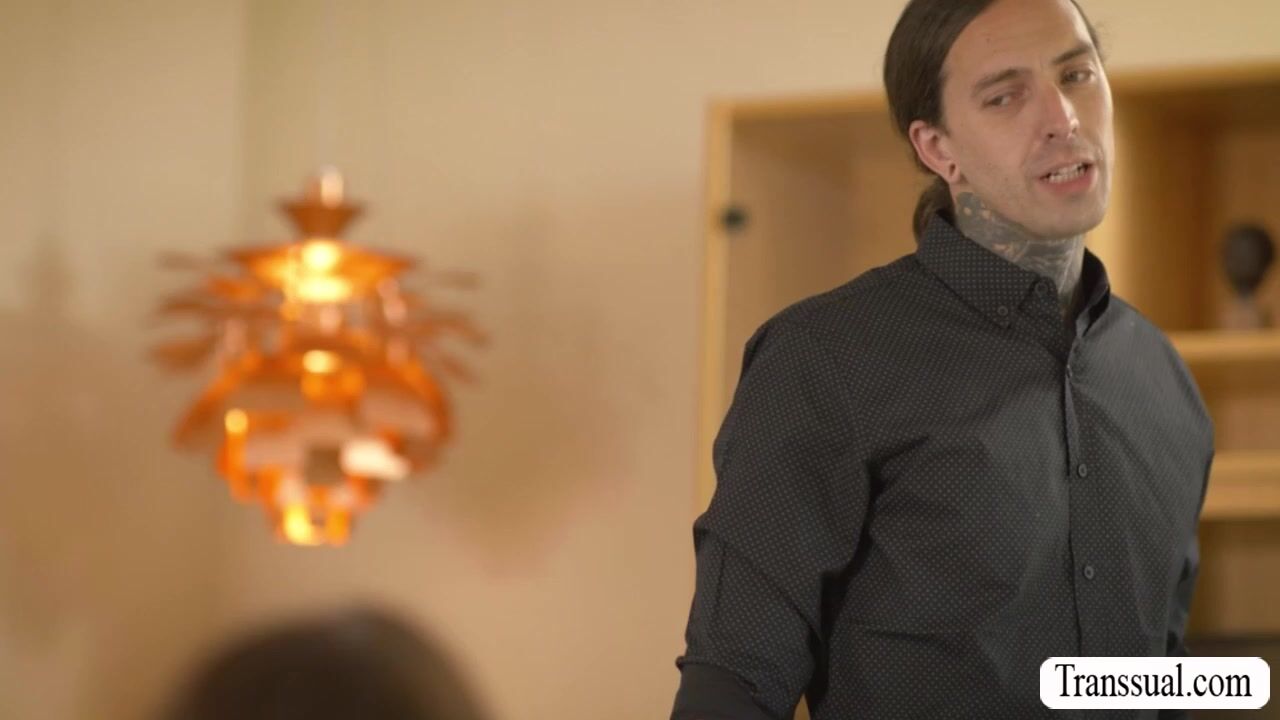 Tall shemale have a toast with her co workmate in her place.After that,they get horny and she lets the guy suck her tranny cock passionately.In return,she lets him lick her ass first to makes it wet and barebacks it so deep and hard.