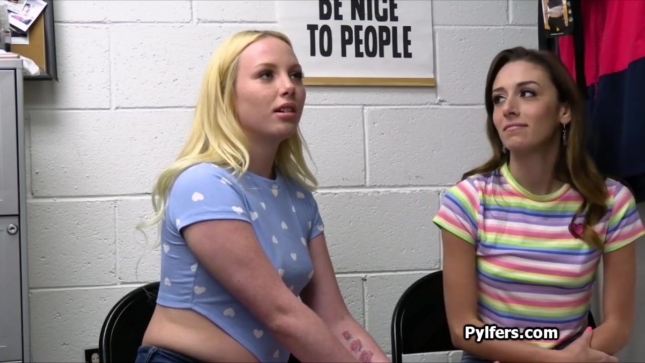 Thick blonde and fit brunette girlfriends are in deep fucking trouble. Office caught them stealing cosmetics and now they need to ridehis hard dick!