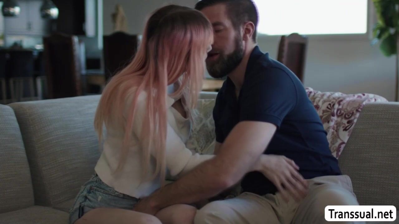 Bearded dude and his busty pink haired TS stepdaughter are on the couch kissing each other passionately.After that,he lets her throat his hard big cock passionately and in return,he fucks his TS stepdaughters ass so deep and hard.