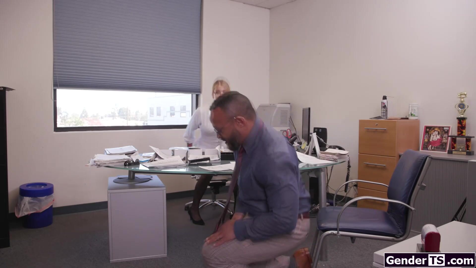 Big tits shemale boss Gracie Jane sees her employee is not paying attention and lures him into dick sucking.The busty tgirl gets her tranny cock deepthroated.The blonde ts gives a handjob and a blowjob.The tattooed trans bareback anal rides his bbc