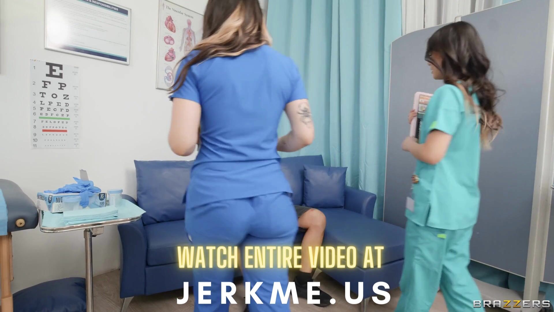 Aria Lee, the slutty sperm clinic nurse, is determined to collect Zac Wild's sample, and she'll wrangle him away from his oblivious girlfriend to do it! Leaving her the waiting room, Aria cheekily takes advantage of her exam-room privacy, teasing Zac with her beautiful asshole while she sucks his swollen cock. When her equally-pervy supervisor (Lulu Chu) joins in, sperm collection becomes imminent as the nurses work in tandem to suck, fuck, and ride his face and cock. Making all that noise and wasting nary a drop into the sample cup, the real question is: What will Zac's girlfriend think when she walks in?