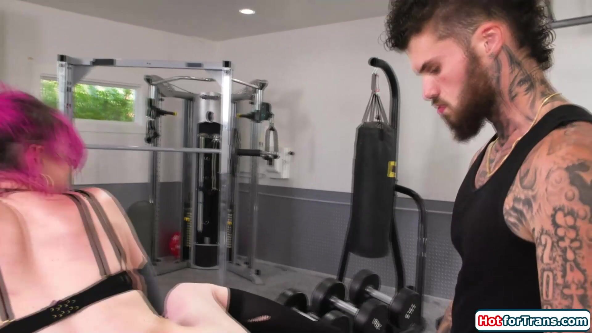 Stuck tattooed shemale babe Lena Moon wants help but the guy first wants to lick her ass.The tgirl sucks his big cock in order for him to release her.As a reward he doggystyle barebacks the tranny.Then the pink haired trans babe anal rides