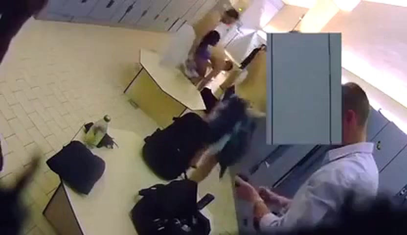 Horny guy masturbating and playing with another guy in a crowded locker room