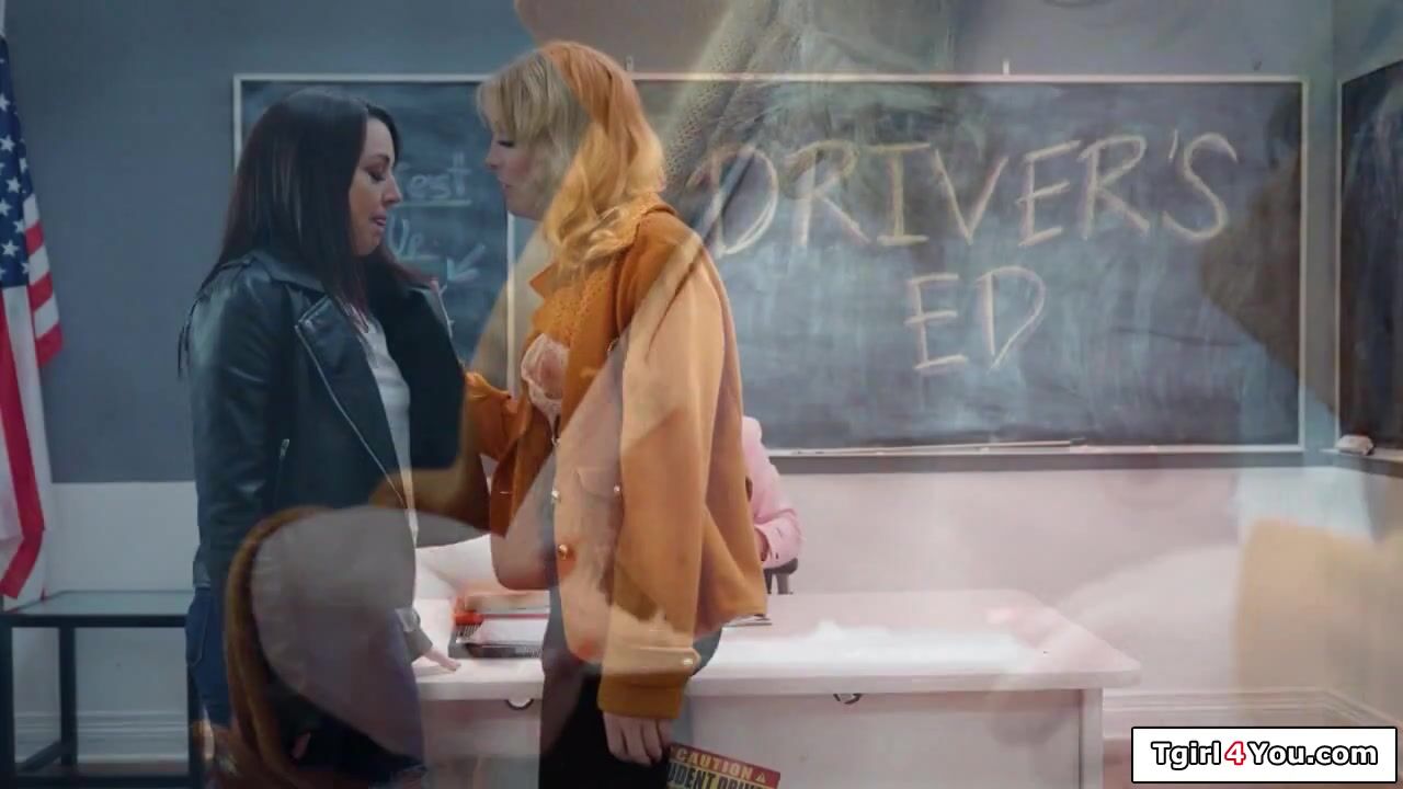 Busty trans Erica Cherry fights with a girl she had a road incident with and tears her clothes.They kiss and the petite babe sucks her big tits.The brunette deepthroats her big tranny cock and the redhead shemale gives her oral sex.The ts fucks her