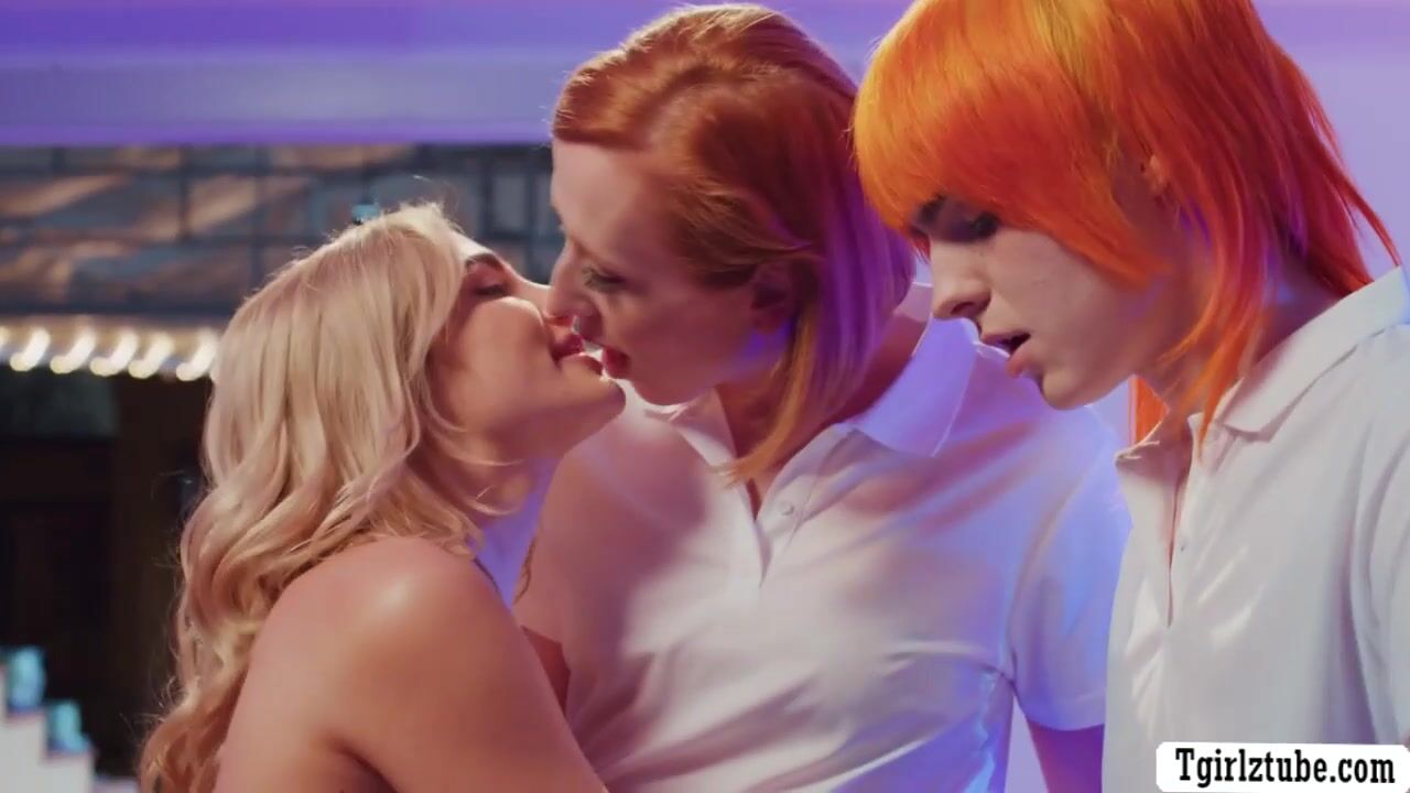 Two redhead TS masseuse give their favorite sexy client a passionate massage.After that,they get horny and they start kissing her.Next is,they let her throat their hard shecock and in return,they lick her pussy before they fuck it so hard.
