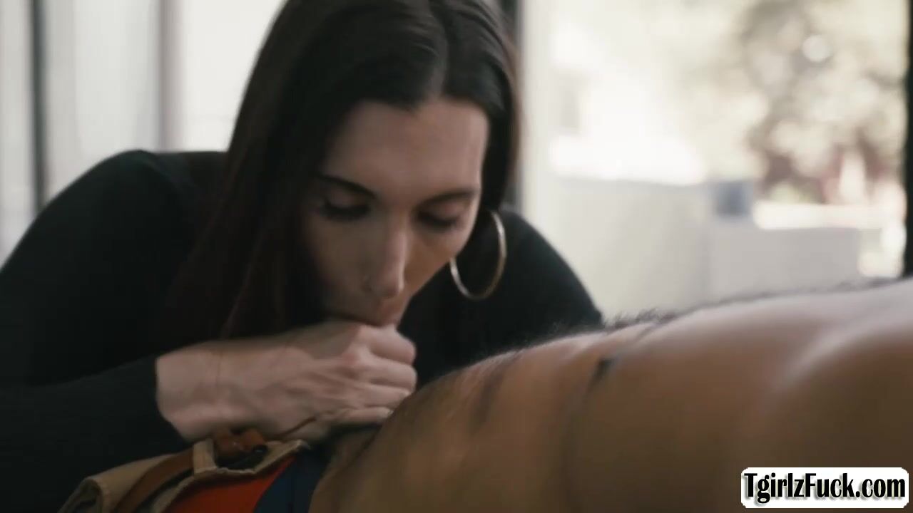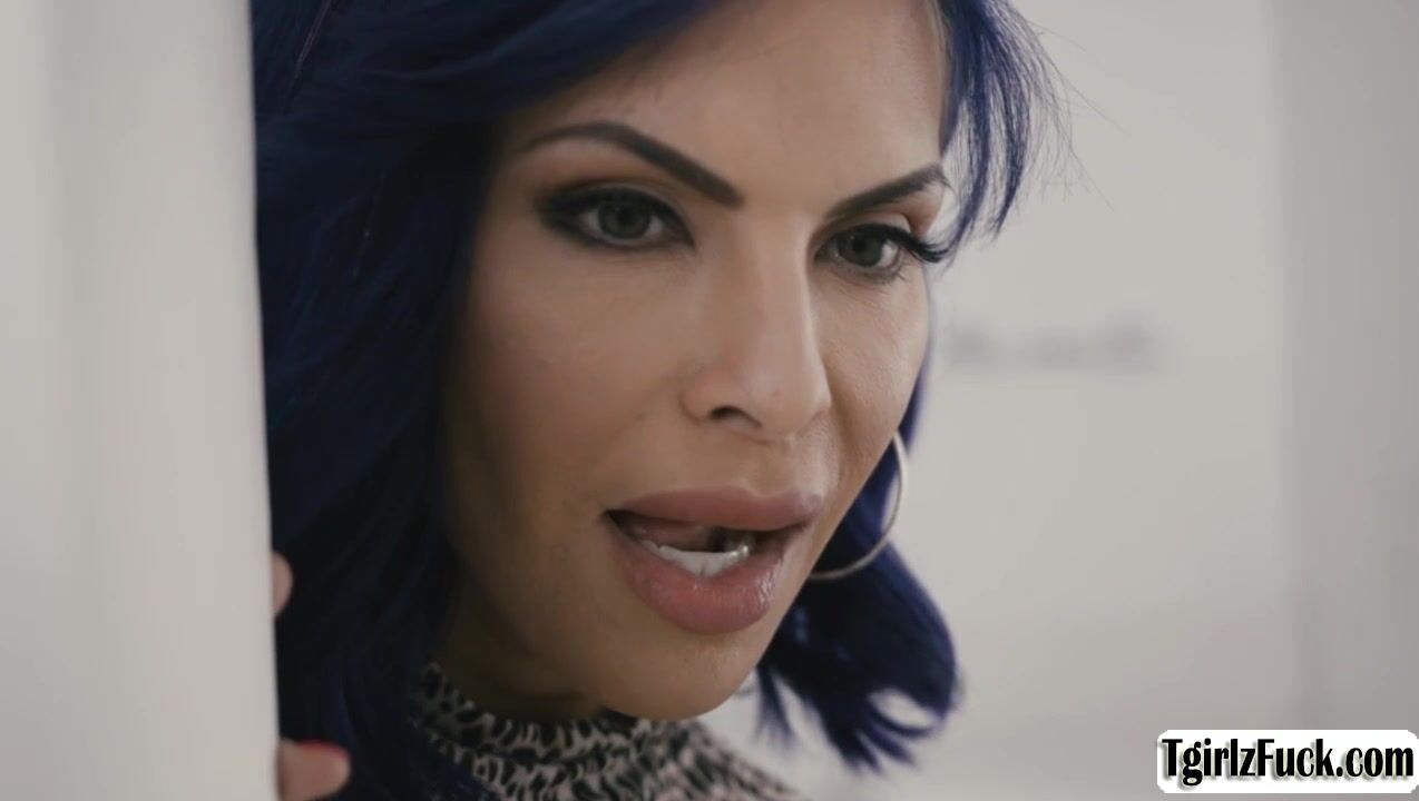 Brunette tbabe Melanie Brooks and her straight guy boyfriend Dillion Diaz to her ts stepsister Foxxy place where the latina transsexual follows him in the bathroom to suck his big black cock and have it in her tight asshole to anal bareback hardcore.