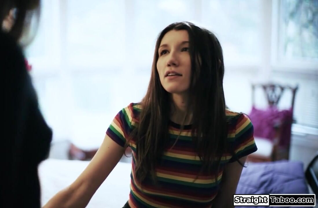 Brunette finds her stepsisters petite gf hiding in her house and makes her kiss her to keep quiet.The cheating girl licks her hairy pussy and the babe sucks her small tits.She has her first time giving oral sex and masturbates her cunt.Then they trib