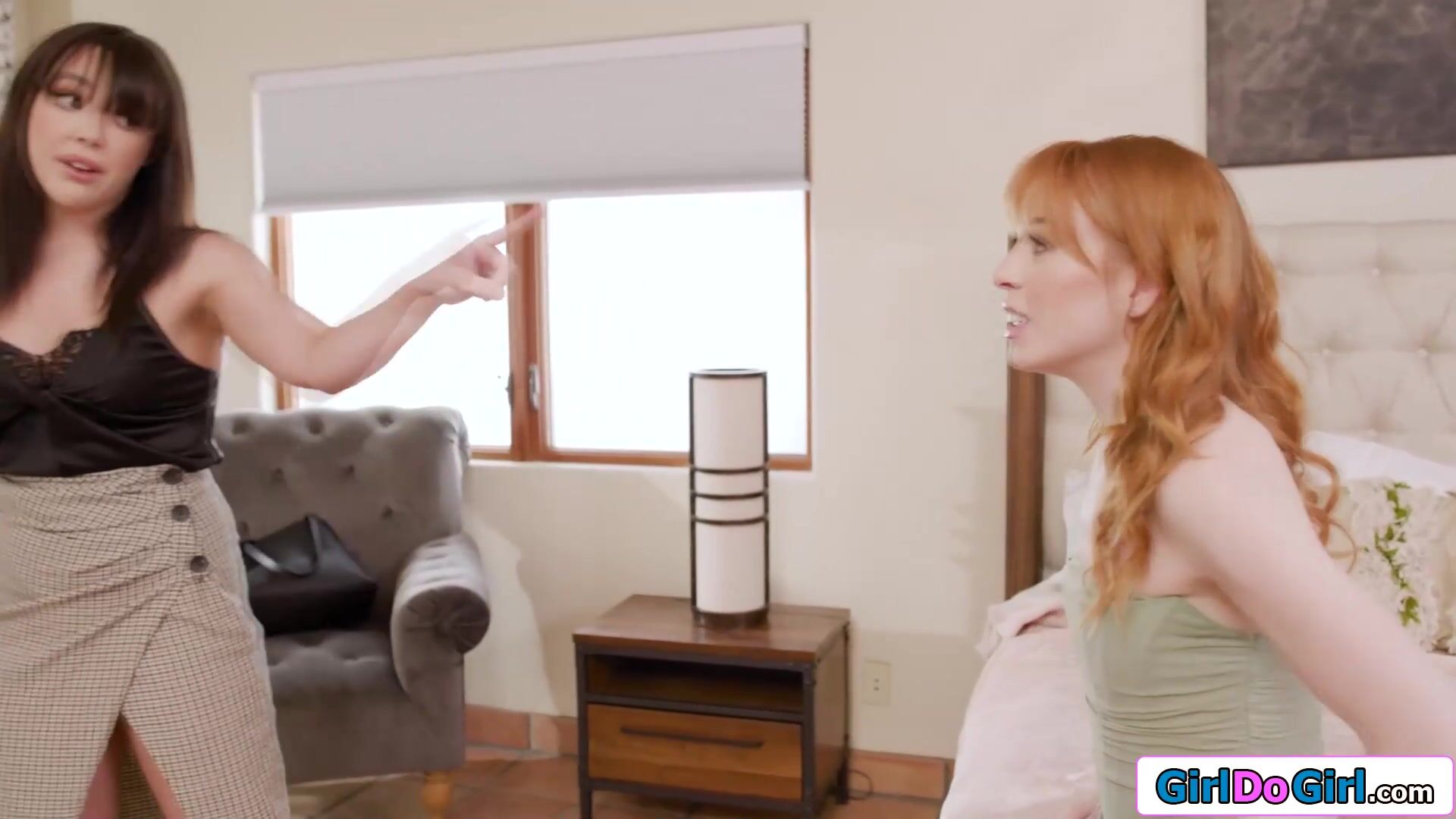 Brunette comes home to her cheating redhead wife and has sex.The petite asian whos hiding in the closet masturbates on them and squirts out an orgasm.She caught but the small tits babe thinks a threesome will boost their marriage and they all lick