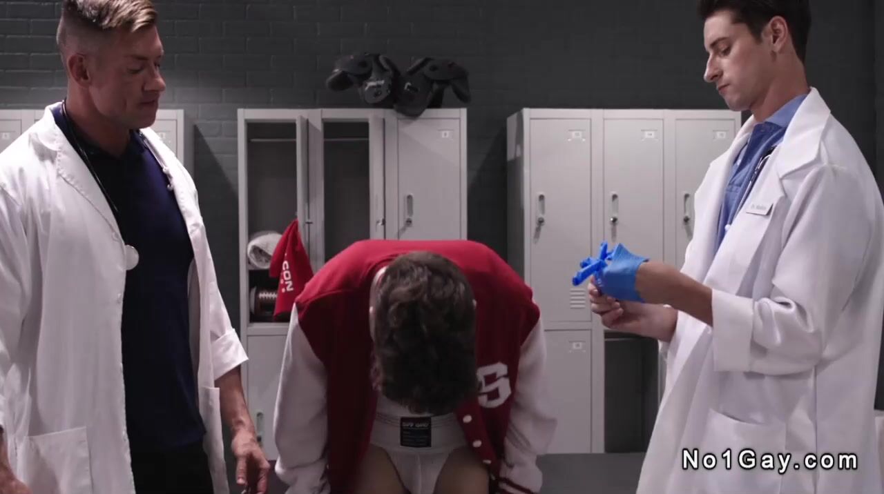 Football player Drake Von is embarrassed when gets boner in front of doctor Bruce Beckham and Taylor Reign then they have anal threesome sex in locker room