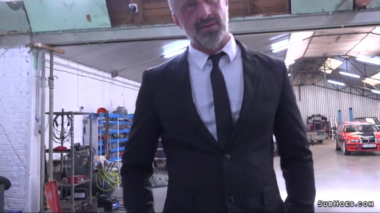 Sexy hot and dirty brunette submissive slut in black lingerie Vittoria Divine gets doggy anal fucking with cumshots slapping and throat fucking from big dick in the car tire change shop