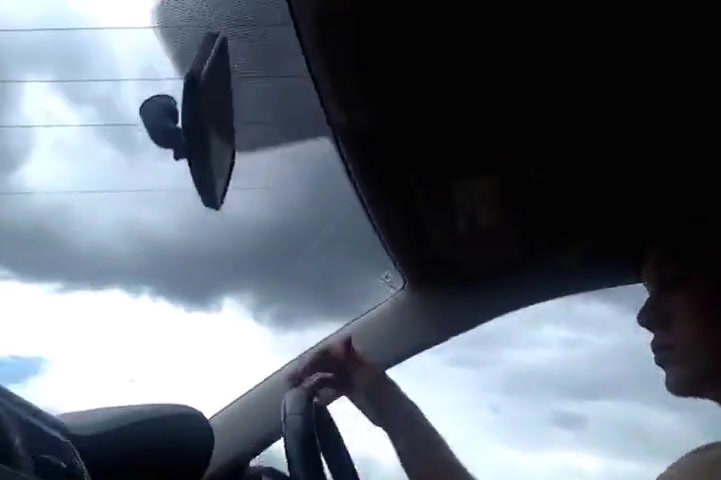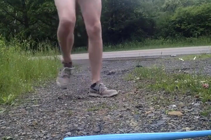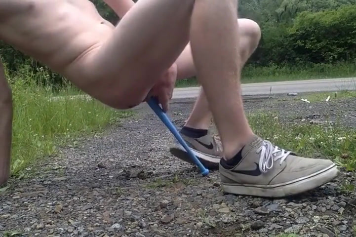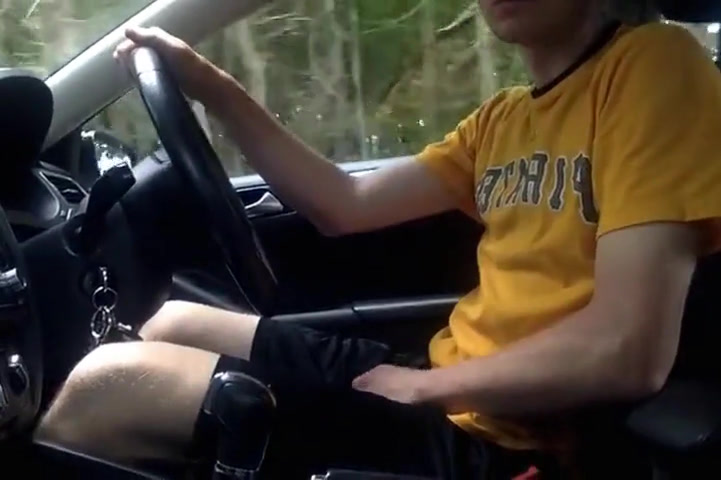 A sexy naked twink plays with his hard cock while driving and then pulls over to jerk off in public by the side of the road.