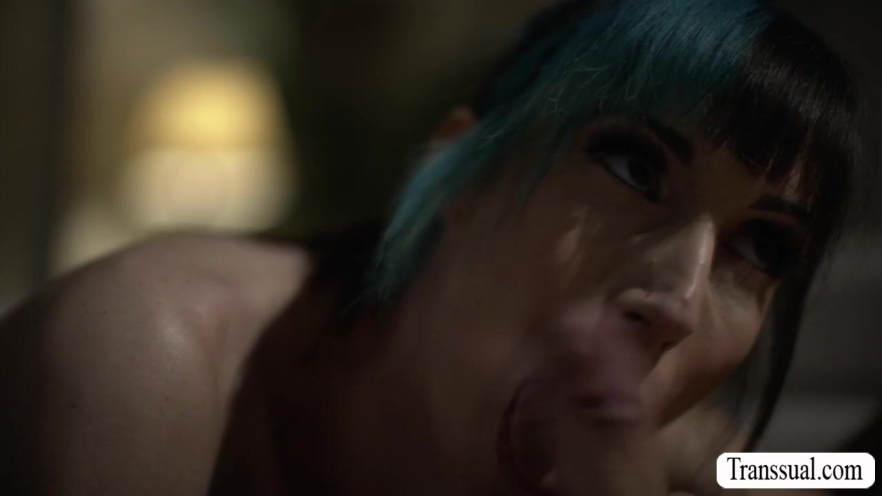 Busty brunette TS Melanie Brooks and her stepson are kissing each other on the bed.After that,she throats hard big dick passionately and in return,her stepson bareback fucks her wet asshole so deep and hard.