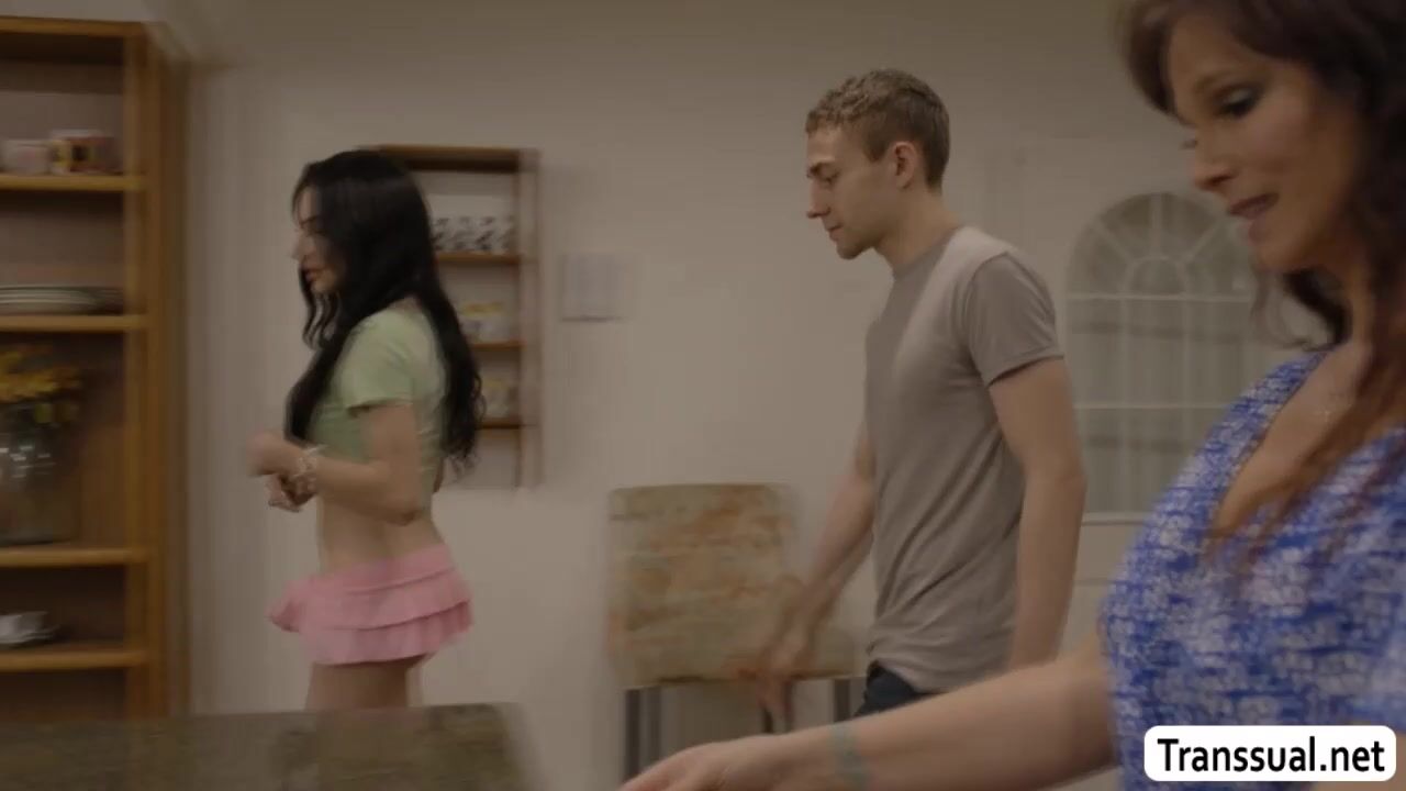 Horny shemale ass fucks her boyfriends MILF stepmom in kitchen