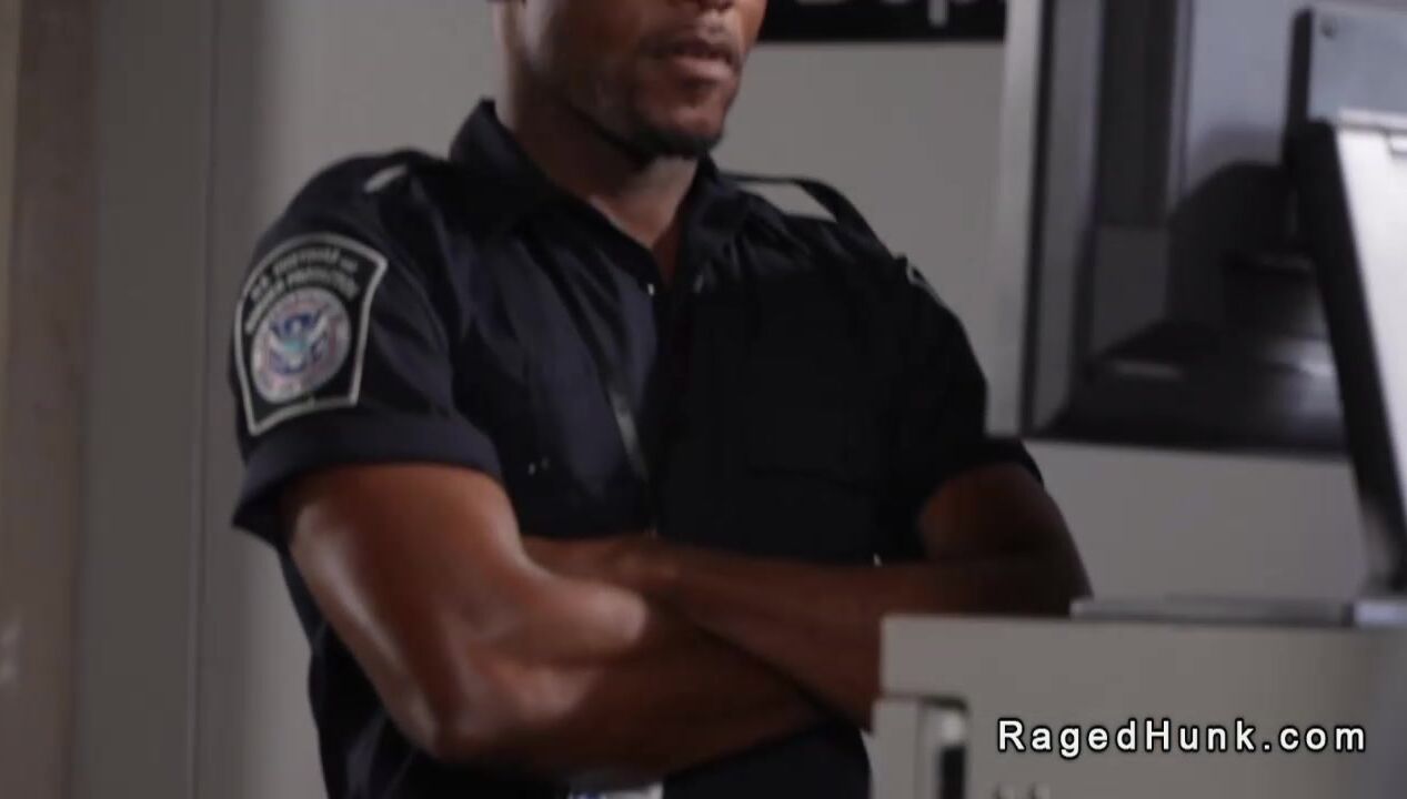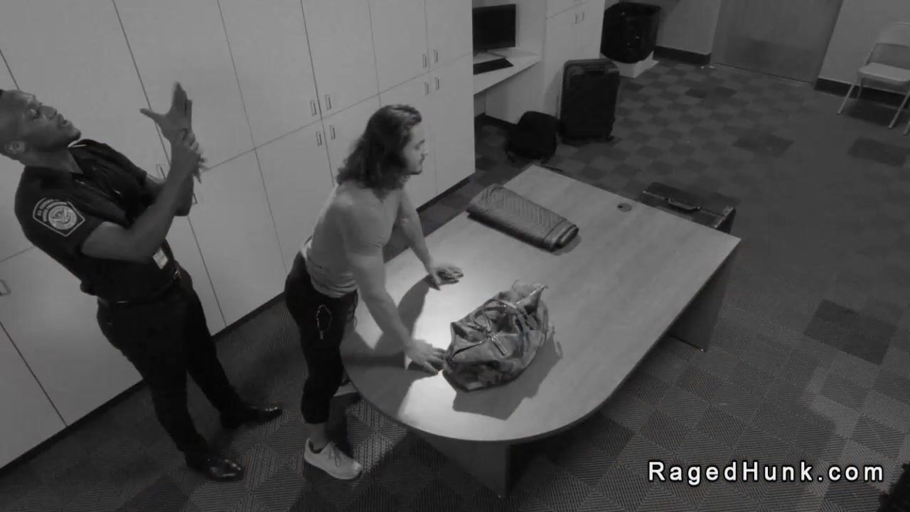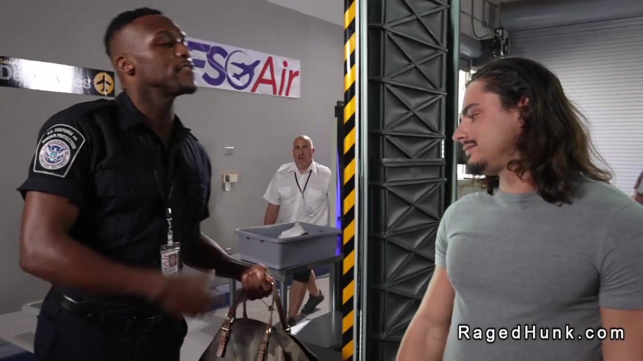 Black airport agent Andre Donovan notices a foreign object on ass of Luca del Rey and in back room he finds butt plug then anal fucks him with bbc in various positions