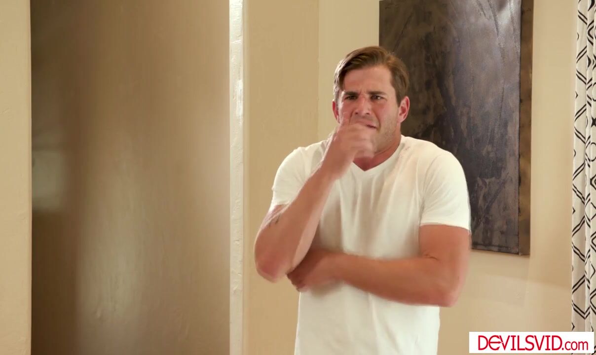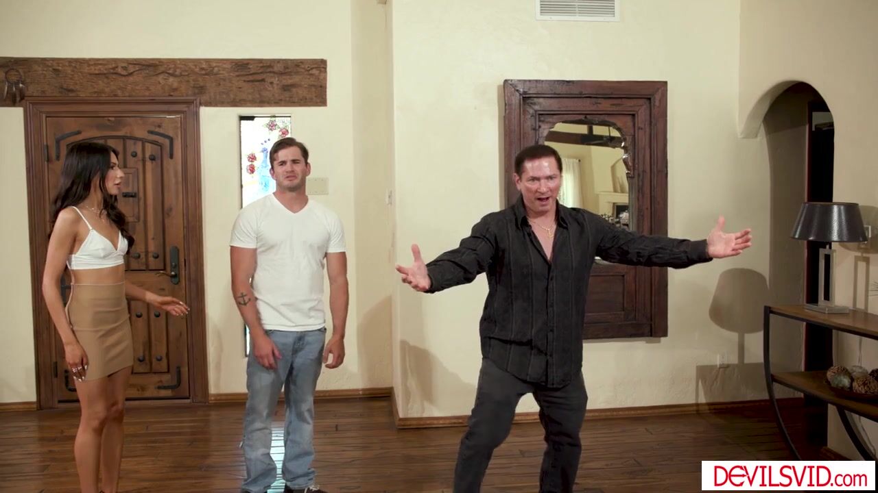 Wife welcomes their neighbor.She gets horny after knowing that hes a swinger.The guy gets naked on the bed and so she rides his big cock.Her husband joins in for a threesome.The latina sucks her husbands balls while getting fucked on the other end.