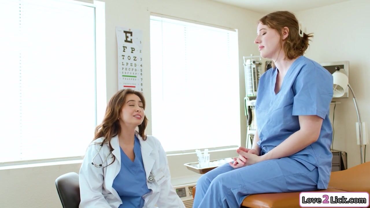 Doctor gives a breast exam to a busty intern and the blonde gets aroused.They kiss and the uniformed girl sucks her big tits.The brunette gives her a rimjob as she masturbates her hairy pussy.The babe licks her shaved pussy and then dovefucks her