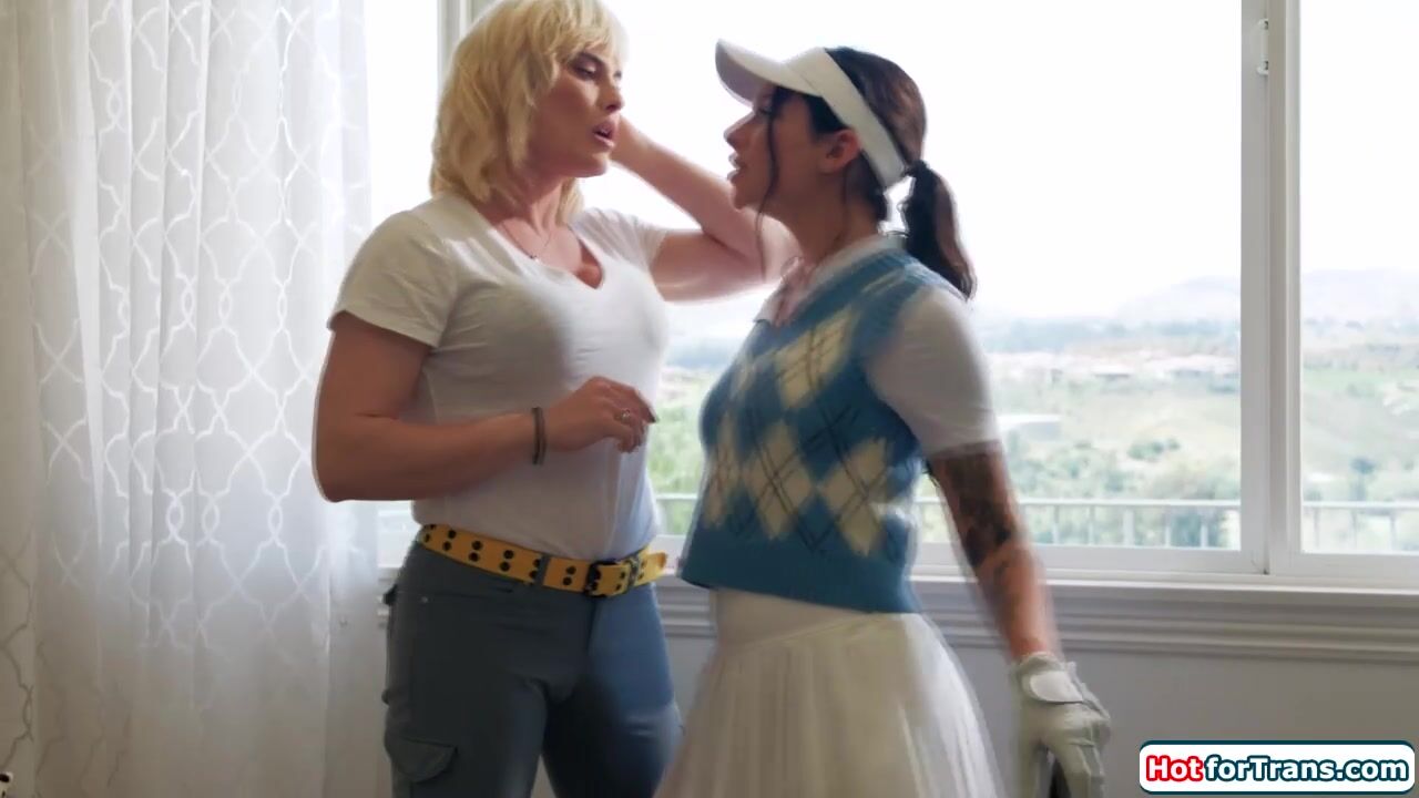 Busty shemale Lucy Hart tries to teach her gf April Olsen how to golf but the tattooed babe want to get fucked.They make out and April is pussy licked by the tgirl while sucking in a 69er.The trans is jerked off while rimmed and bangs Aprils pussy