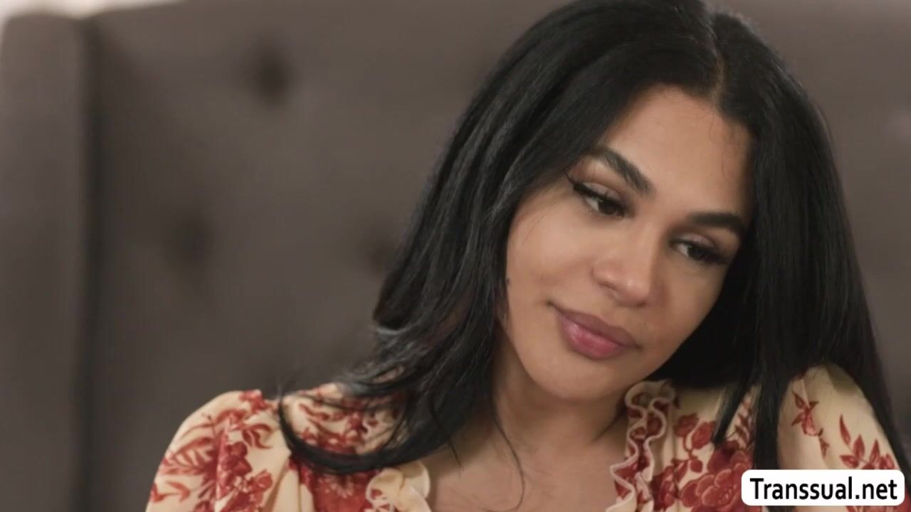 Busty TS Eva Maxim and her boyfriend Draven Navarro are kissing on the bed.After that,he throats her shecock and rides it after.