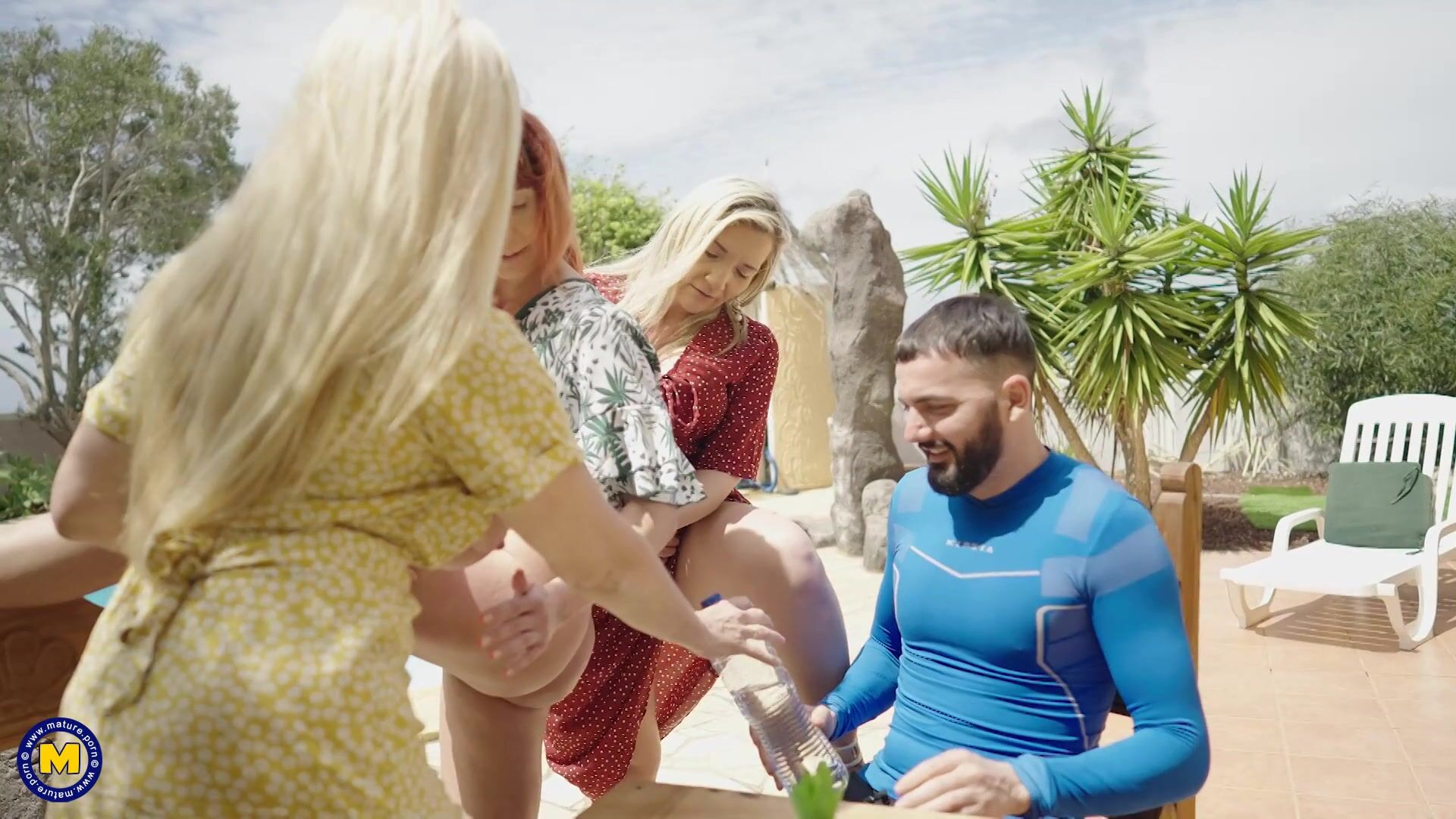 Three hot German MILFs have an outside groupsex party under the sun with one lucky guy