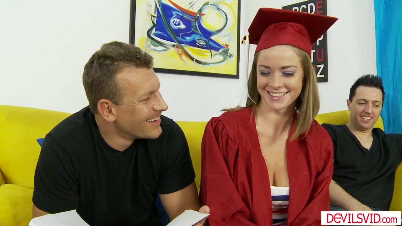 Brunette teen babe is about to graduate in college so she hangs out with her classmates.She wants to get fucked and so the guys gang her up face fucking her while the other is licking her pussy.She holds 2 big cocks while the other is fucking her ass